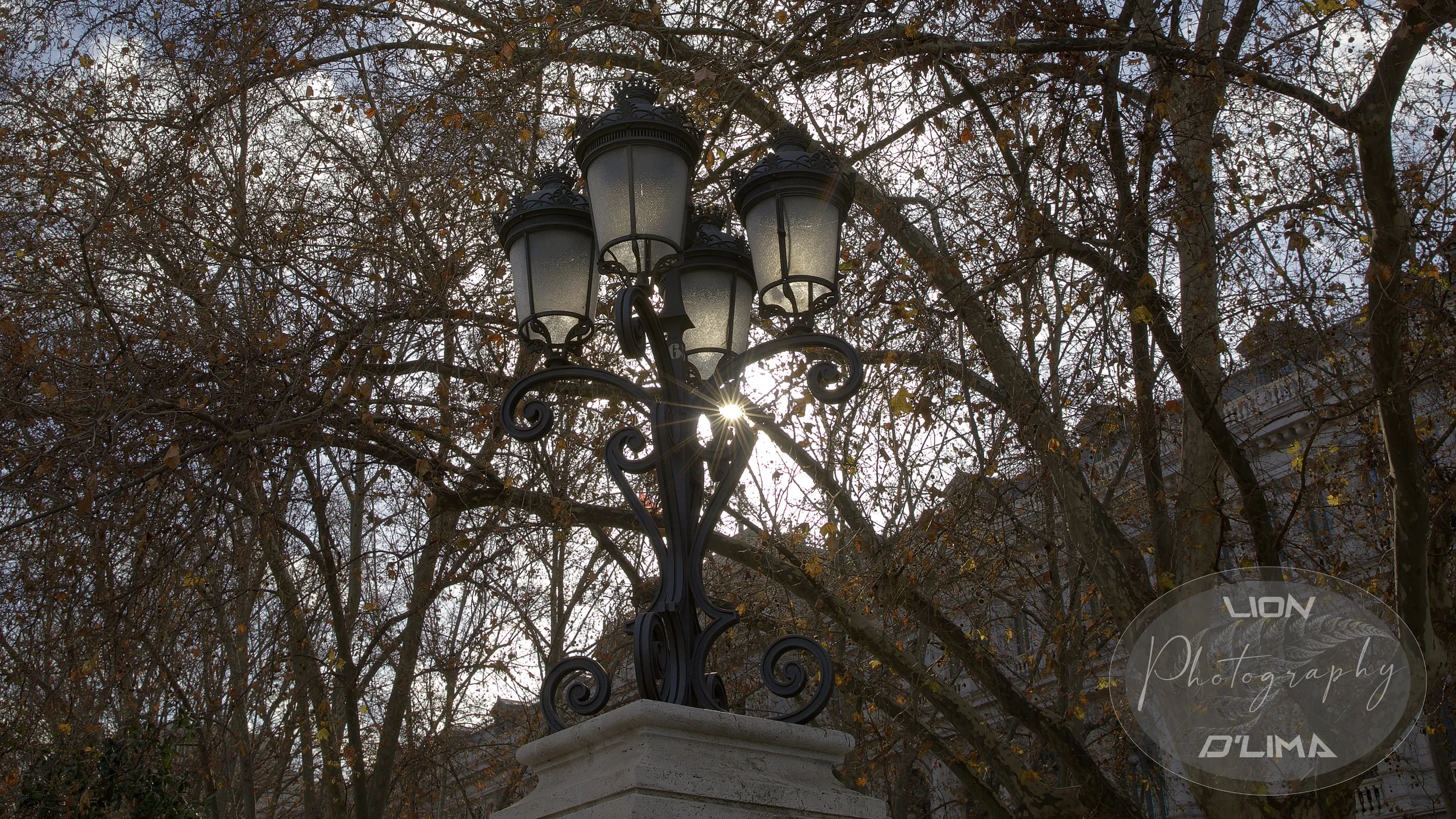 Winter sun gleaming through the trees in a park near Fuente de Cibeles